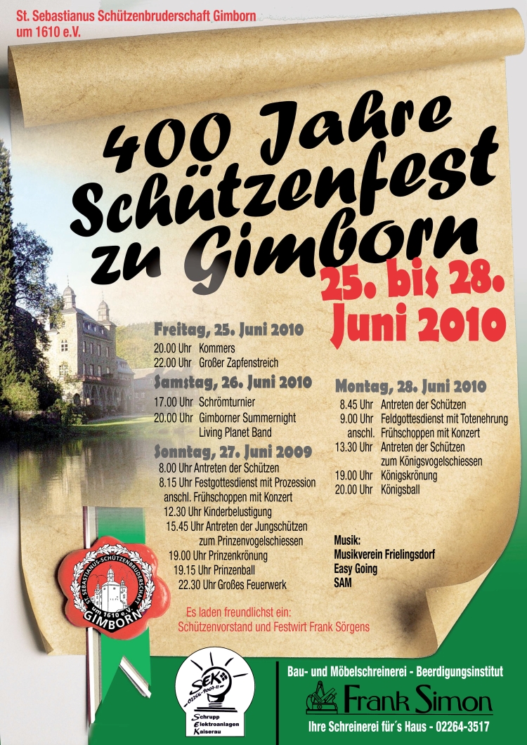 Vom 25. bis 28. Juni 2010 lädt die St. Sebastianus-Schützenbruderschaft Gimborn zum traditionellen Schützenfest ein.